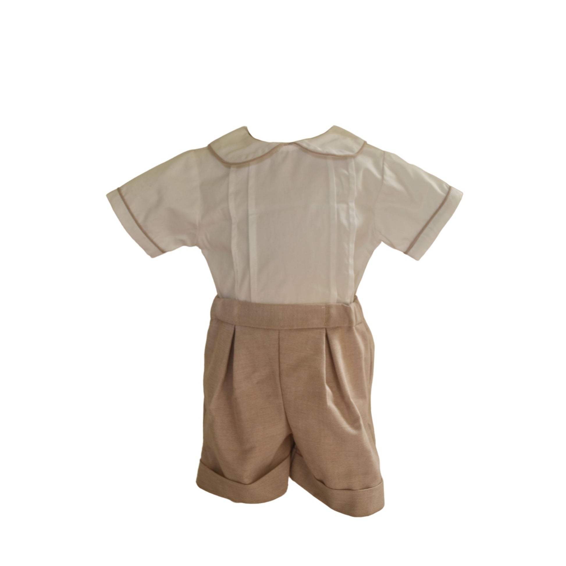 Conjunto adorable para bebés en tono beige. Este trajecito incluye short y una camisa a juego, perfectos para cualquier ocasión. Hecho con materiales cómodos y de alta calidad para mantener a tu pequeño elegante y confortable todo el día.