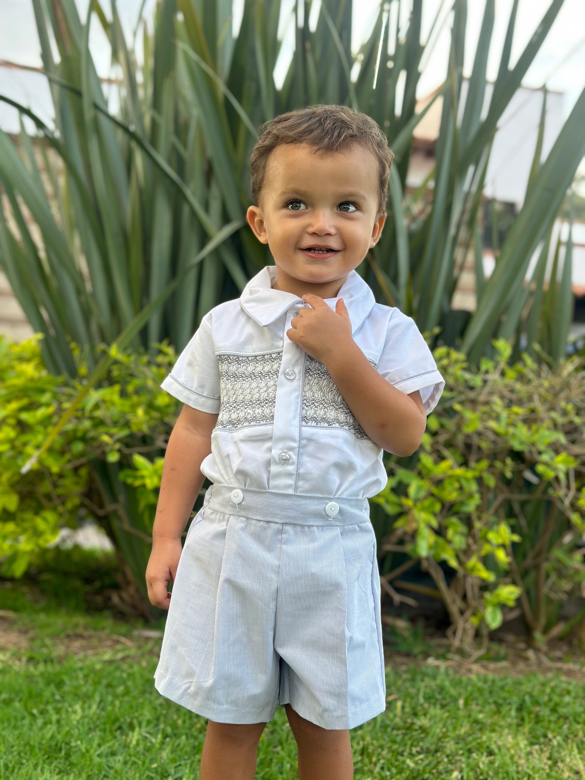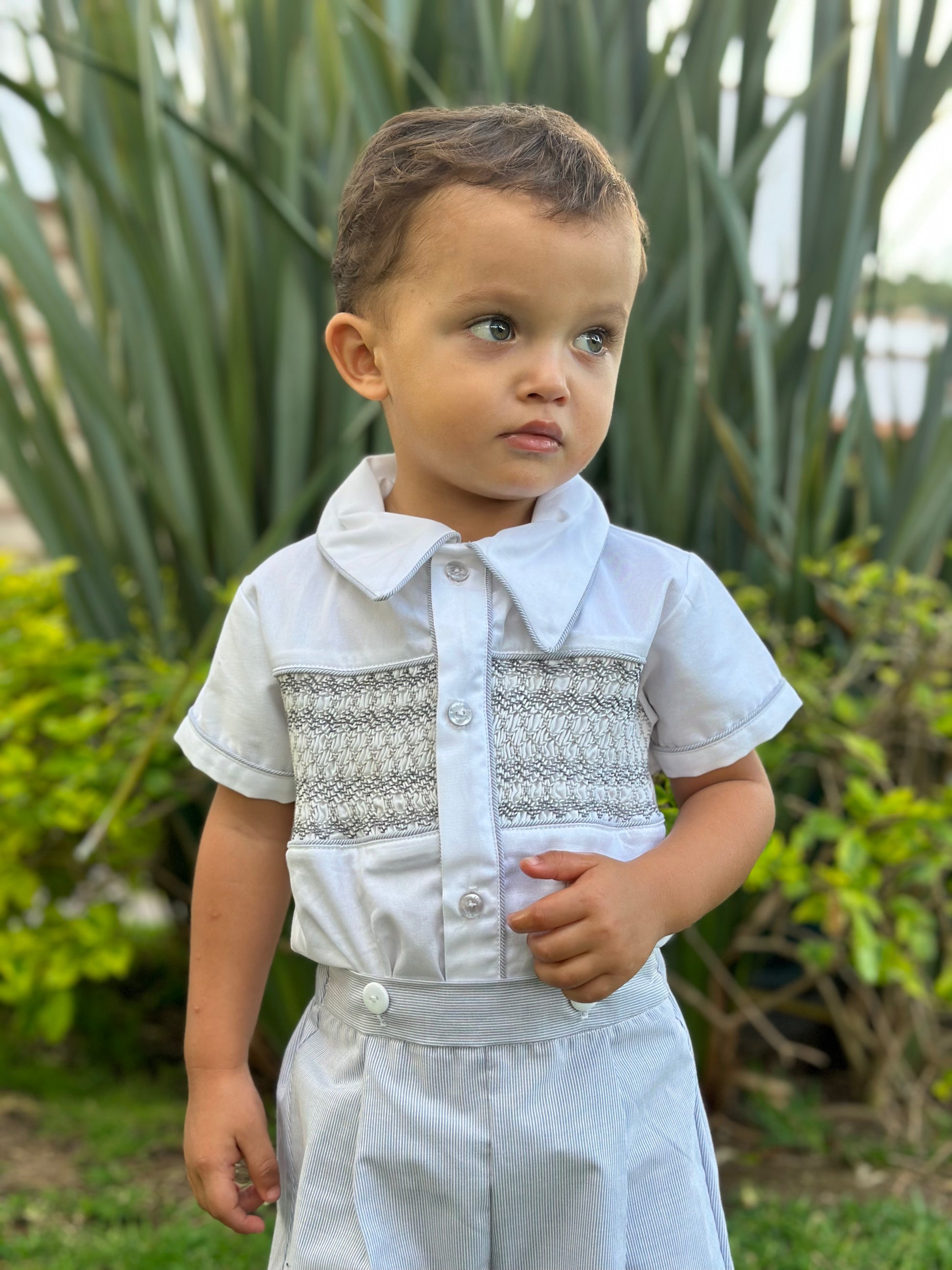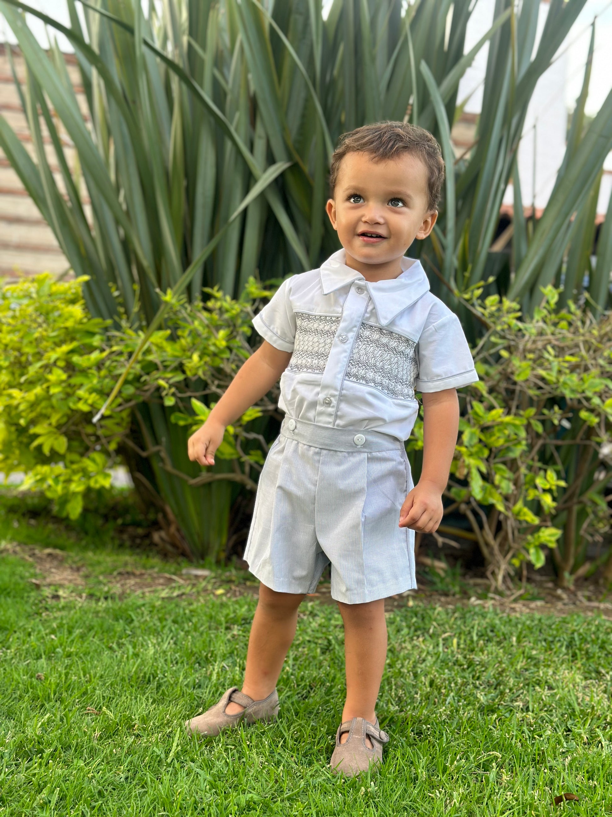 Hermoso trajecito con camisa bordada de smock en tonos grises y su short en tela 100% algodón.