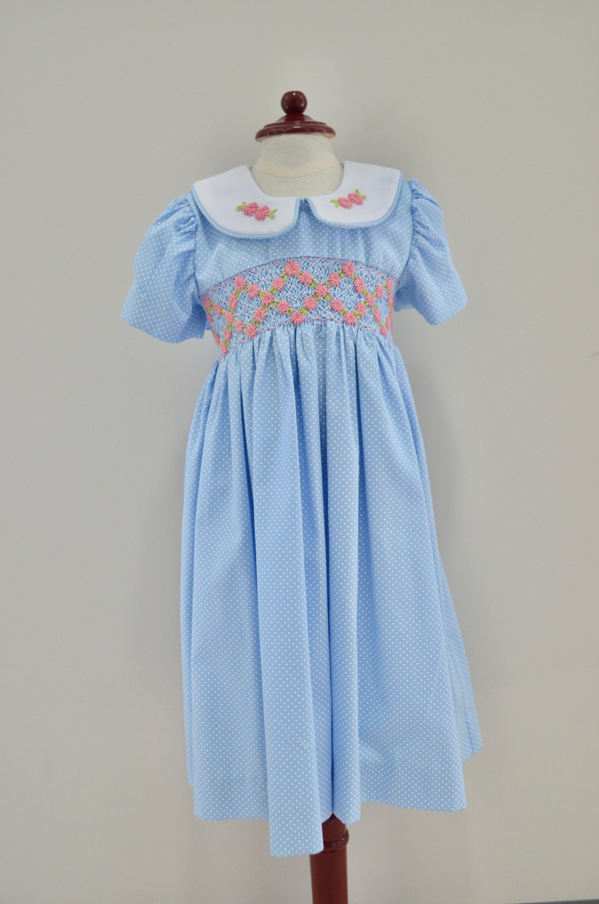 Confeccionado en piqué azul de alta calidad, este elegante vestido presenta un hermoso cuello bordado que añade un toque de sofisticación.