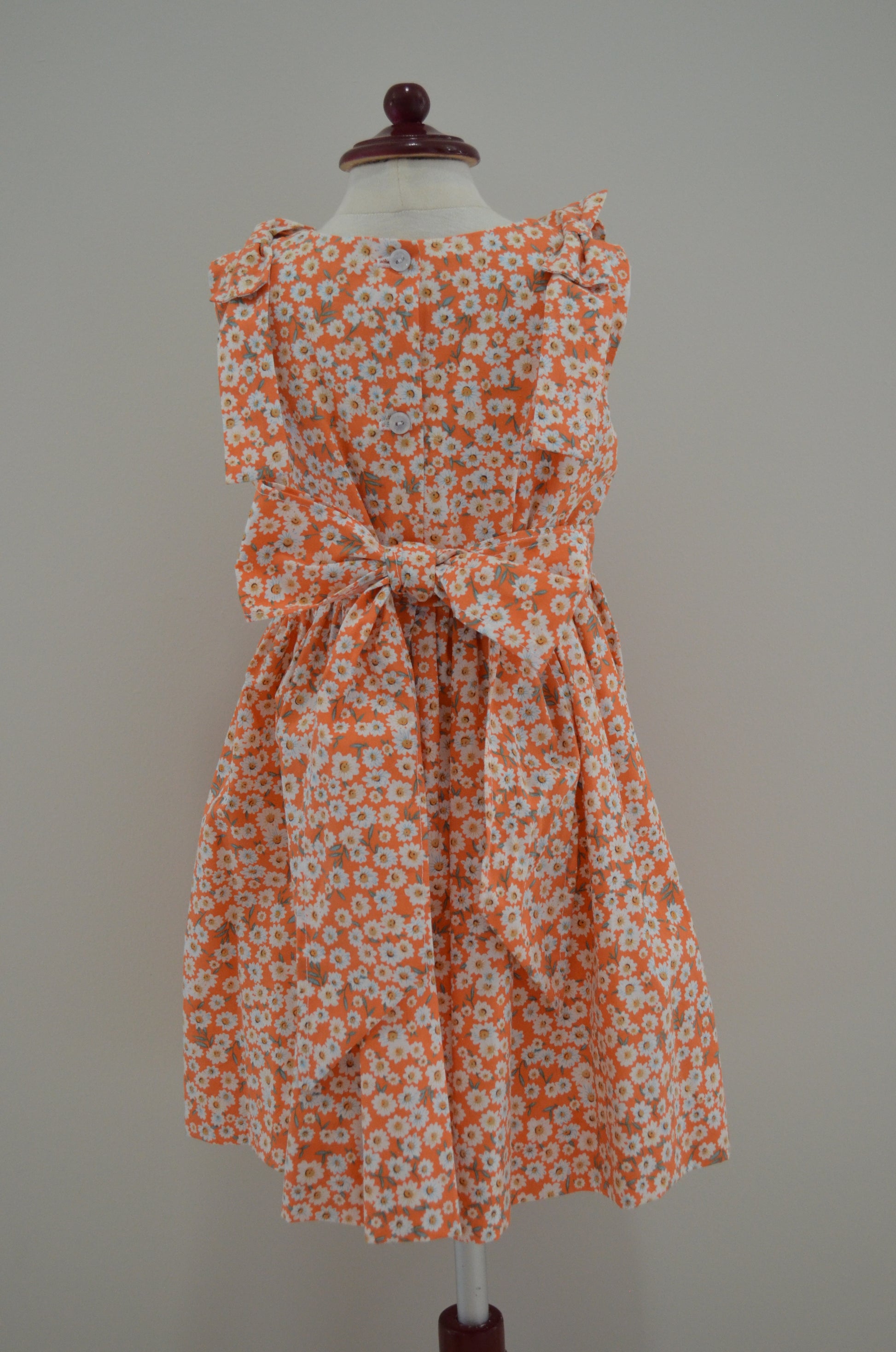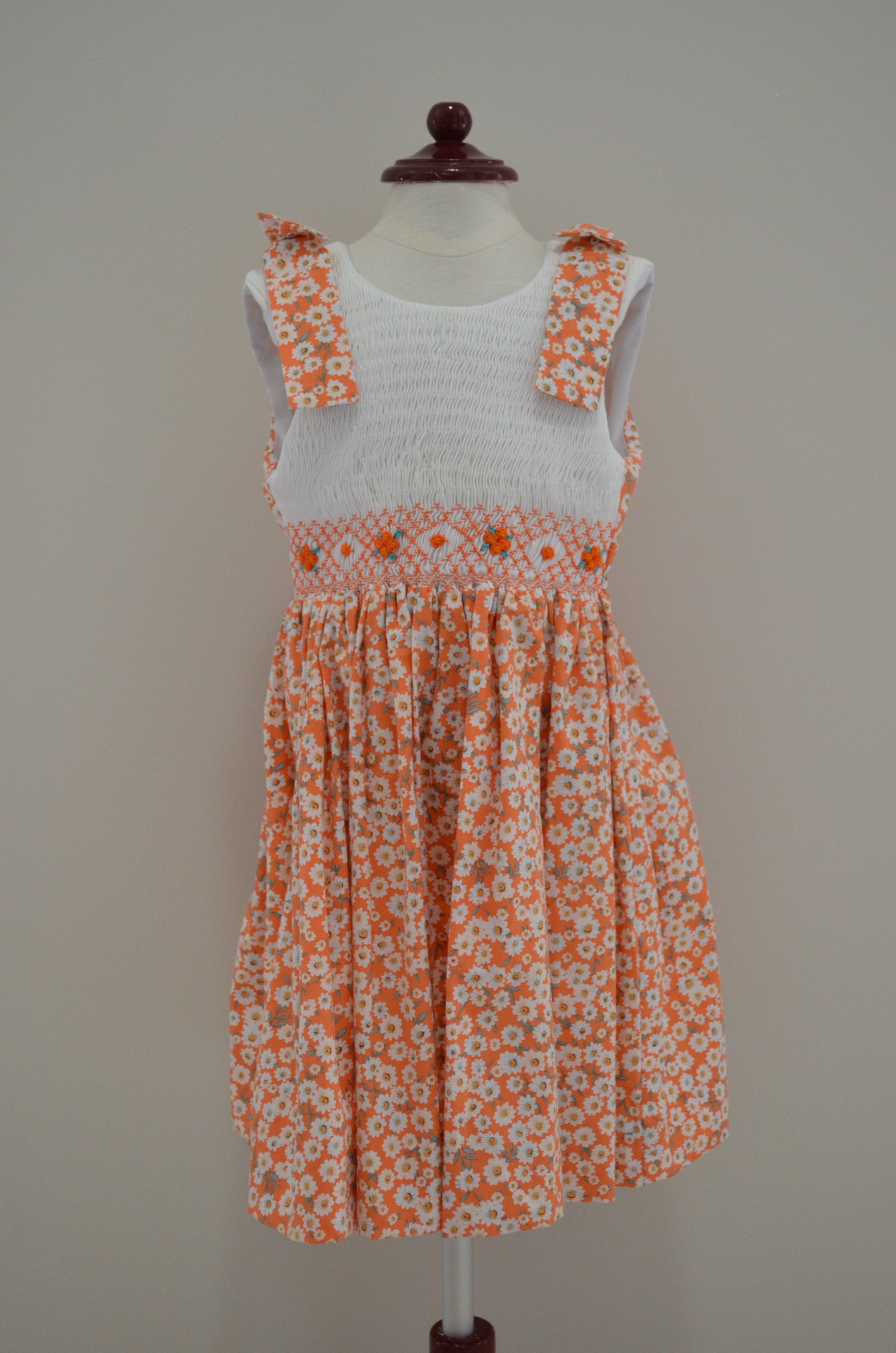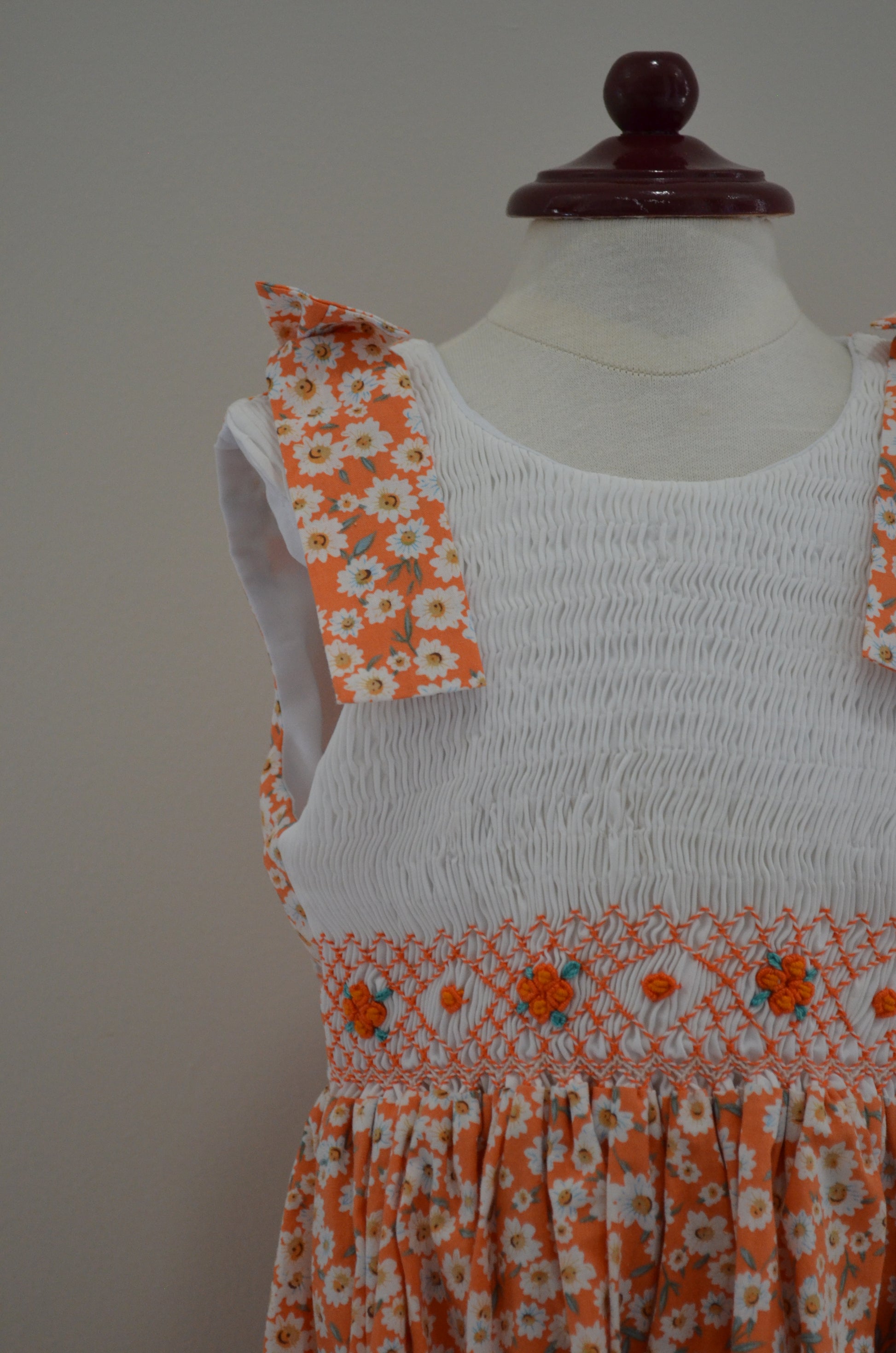 Hermoso vestido con pechera bordada de smock en tonos naranjas, confeccionado en tela 100% algodón.