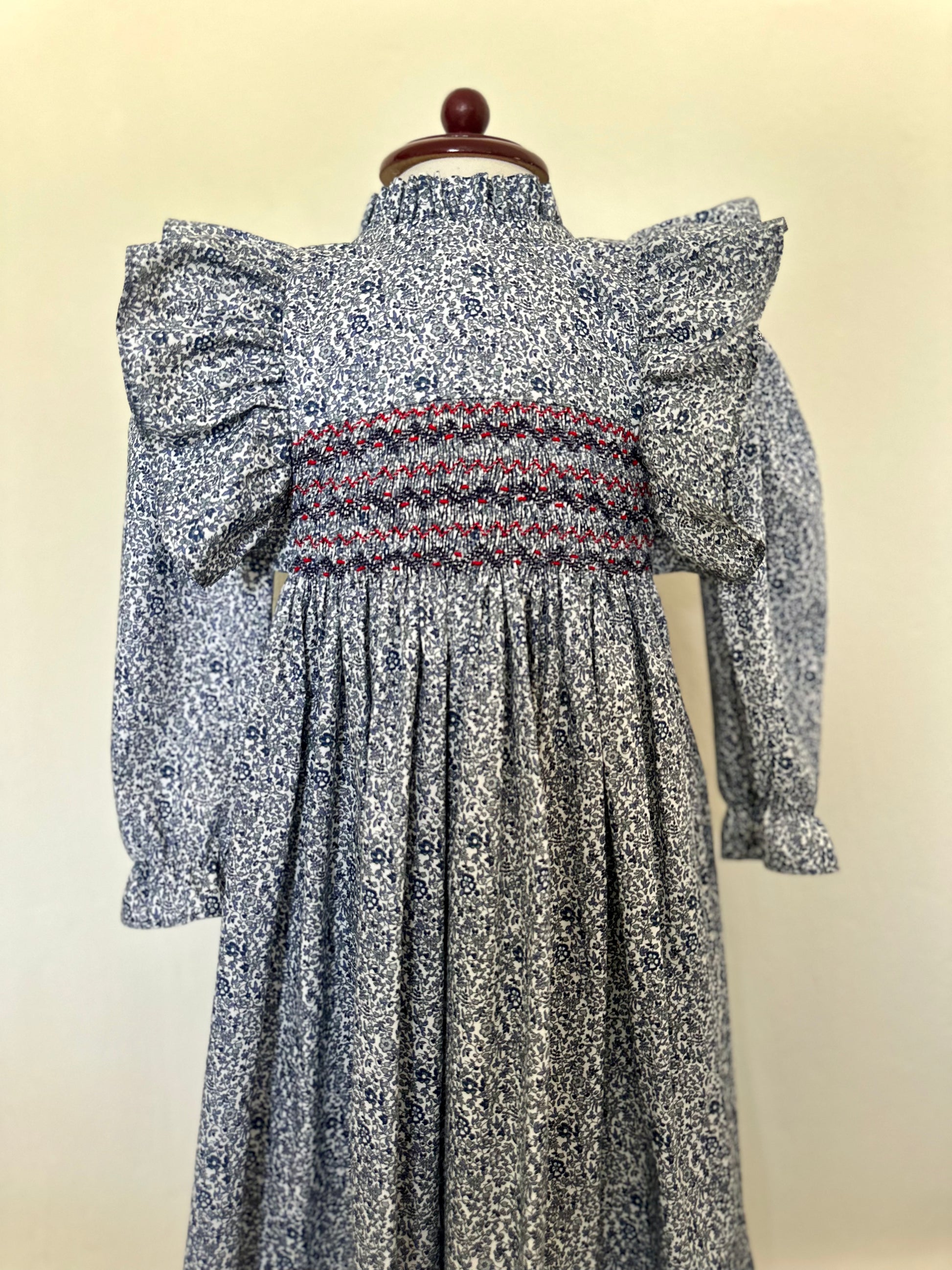 Hermoso vestido con tela en estampado azul marino 100% algodon español y bordado de smock en tonos rojo y azul marino.