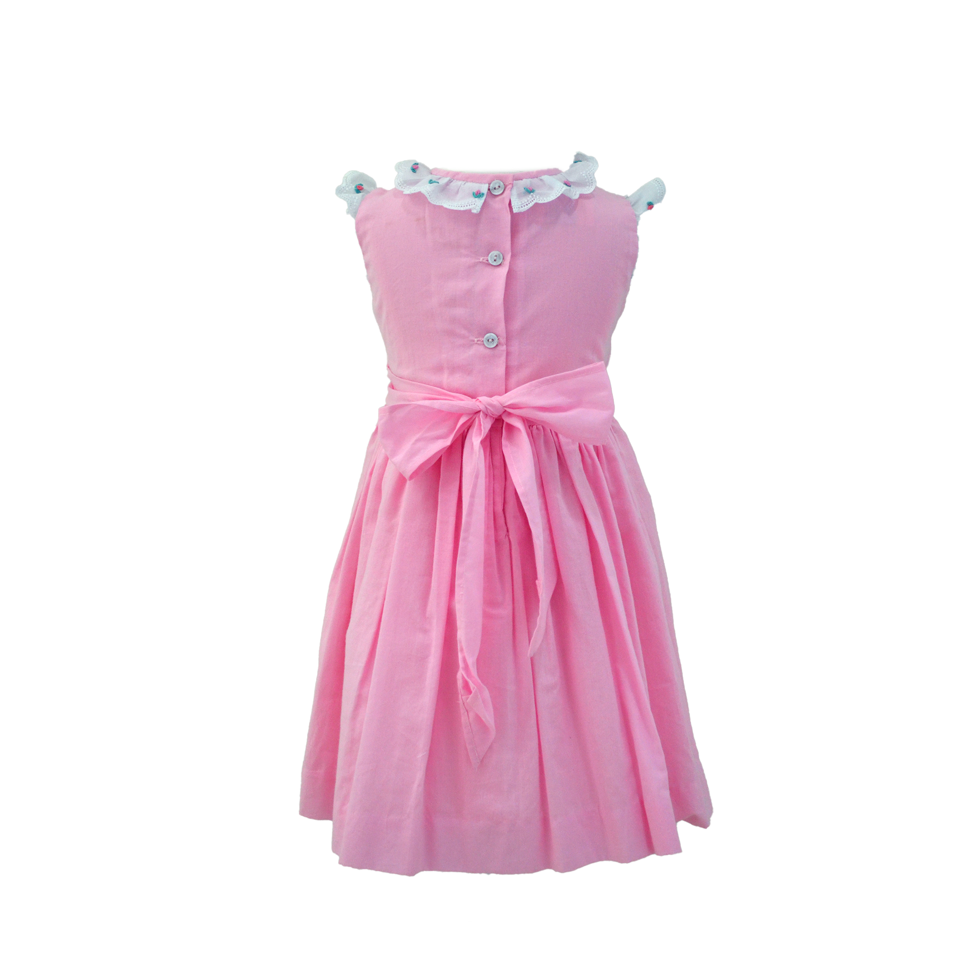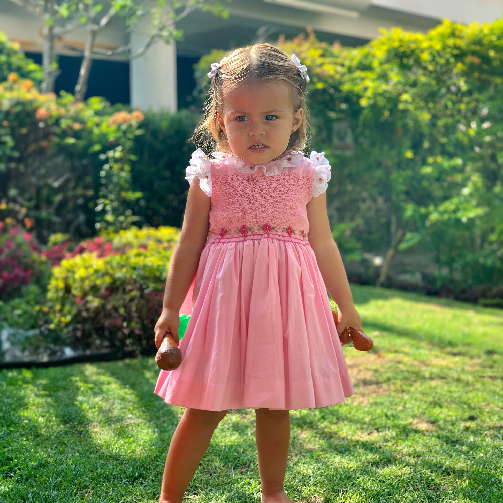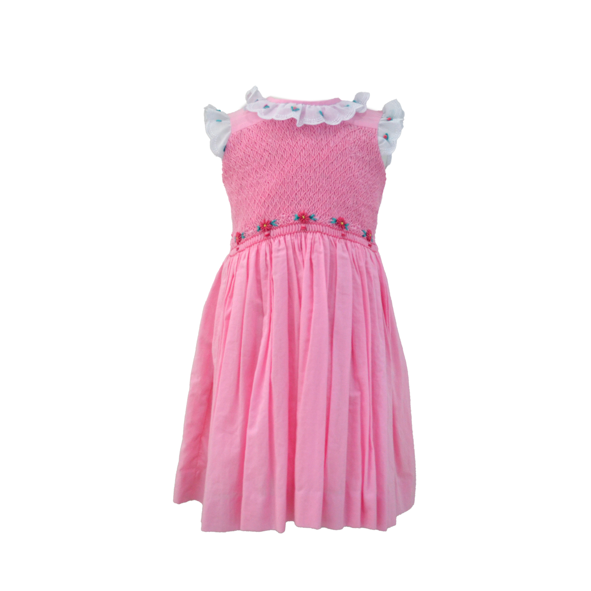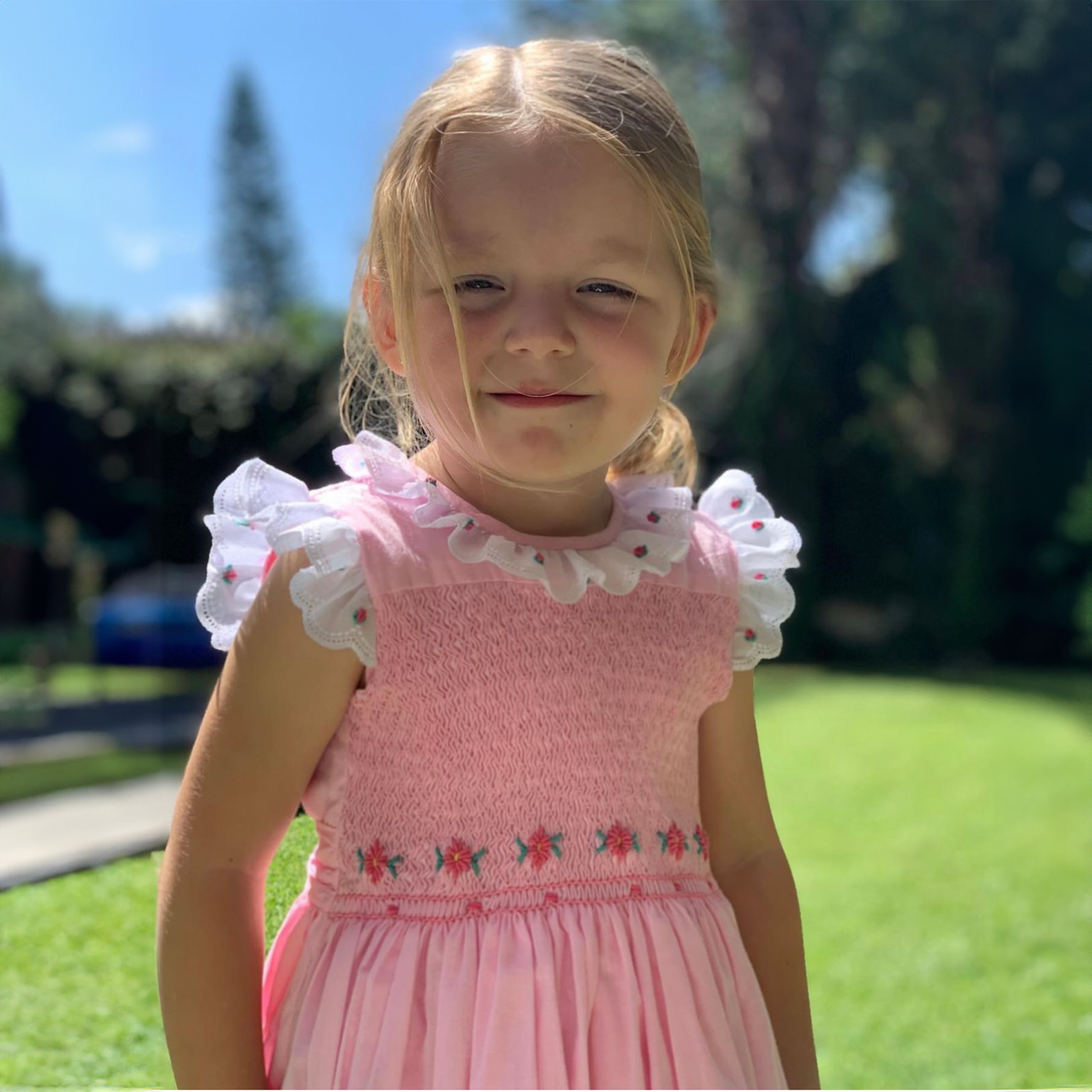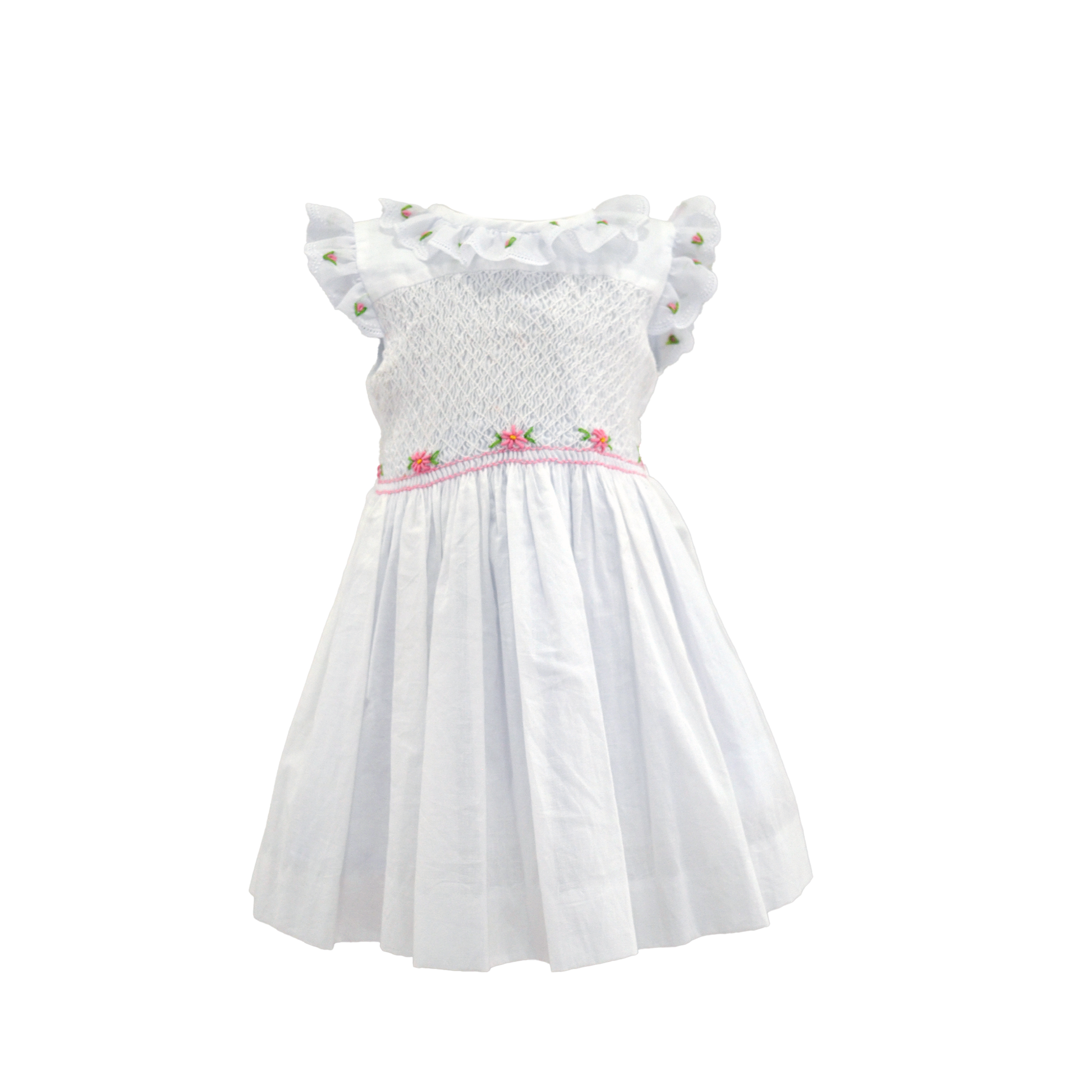 Vestido Greta en blanco y rosa con detalles de bordado de smock y una delicada tira bordada, este vestido añade un toque de sofisticación a cualquier ocasión. Disfruta de un estilo único y femenino con este hermoso diseño