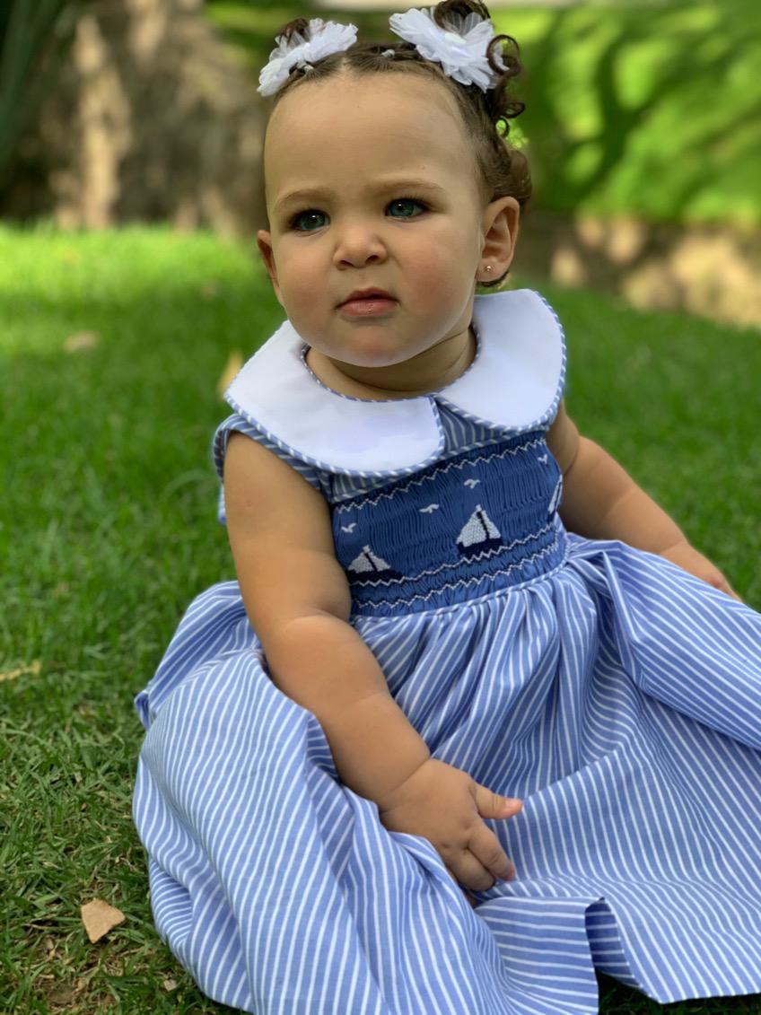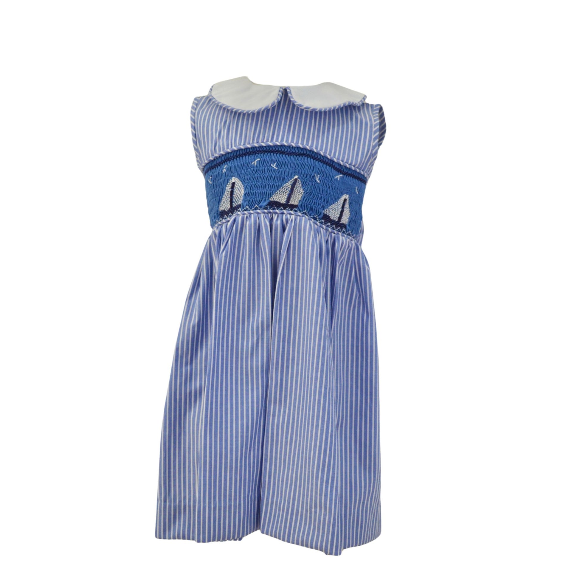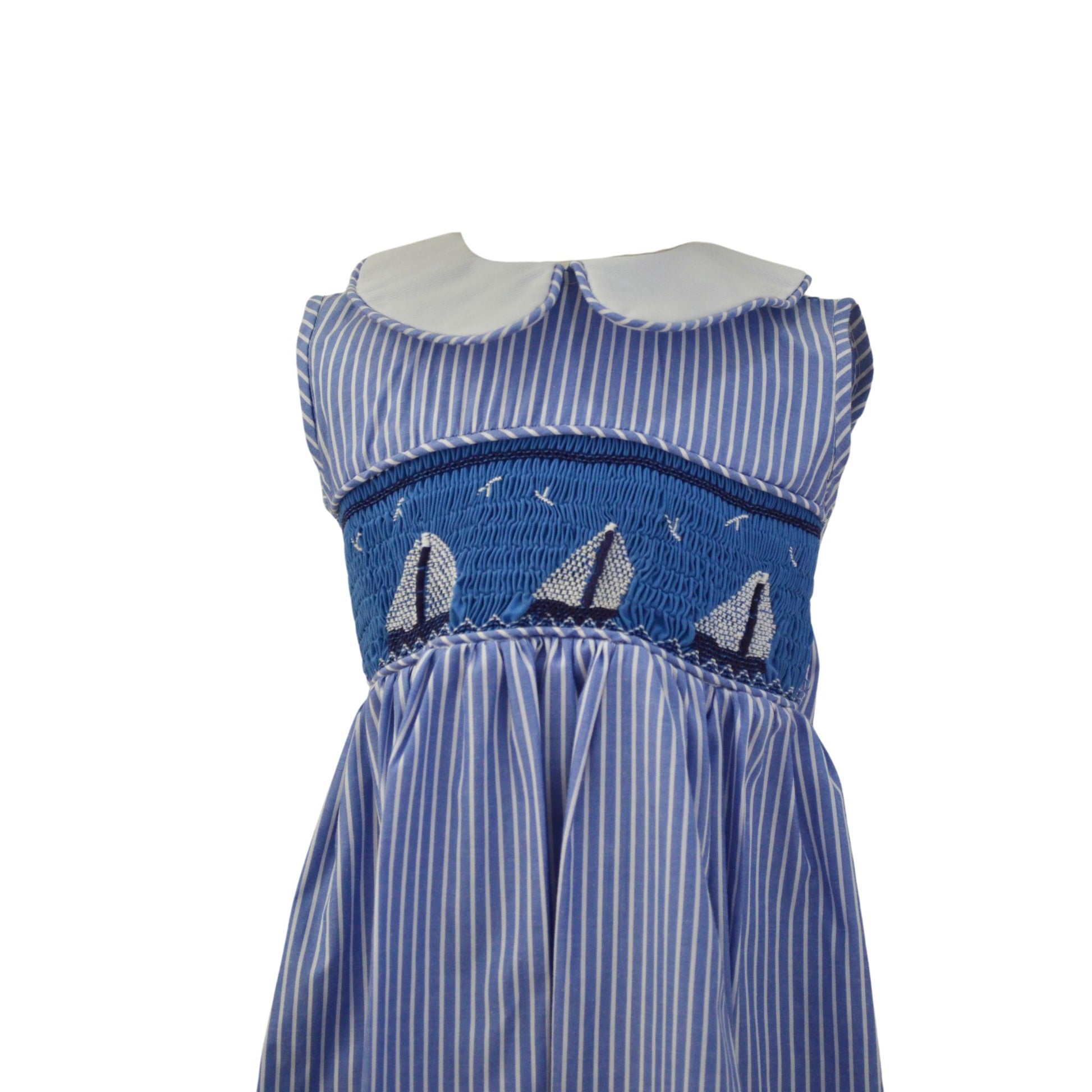 El Vestido Marinera, con adorables barquitos en técnica de smock, combina estilo náutico y comodidad en un diseño encantador para niñas.