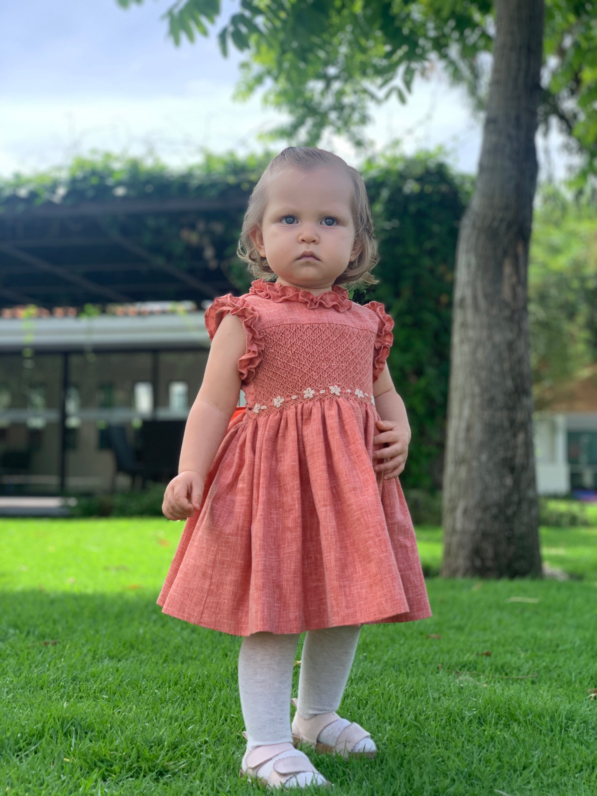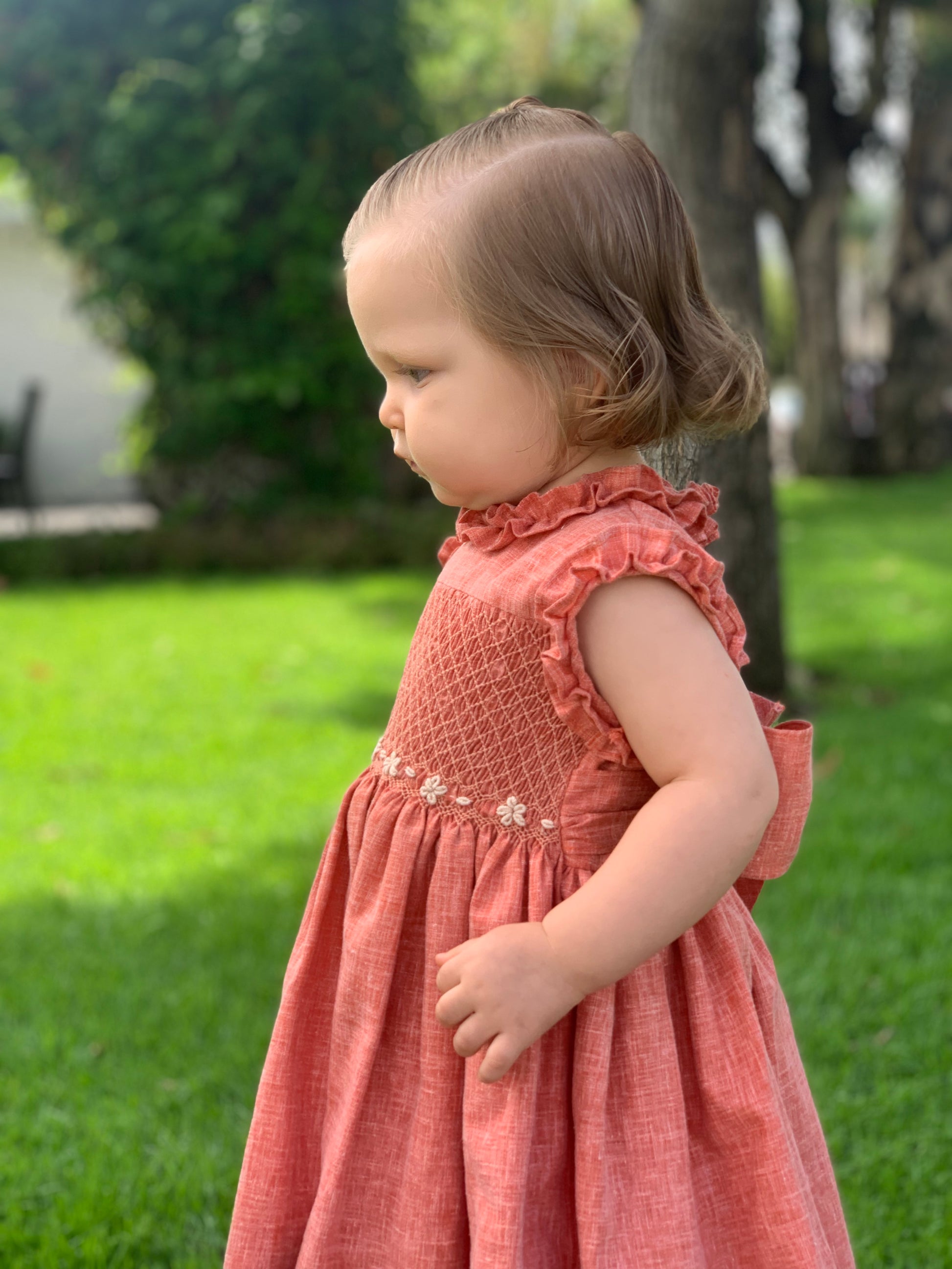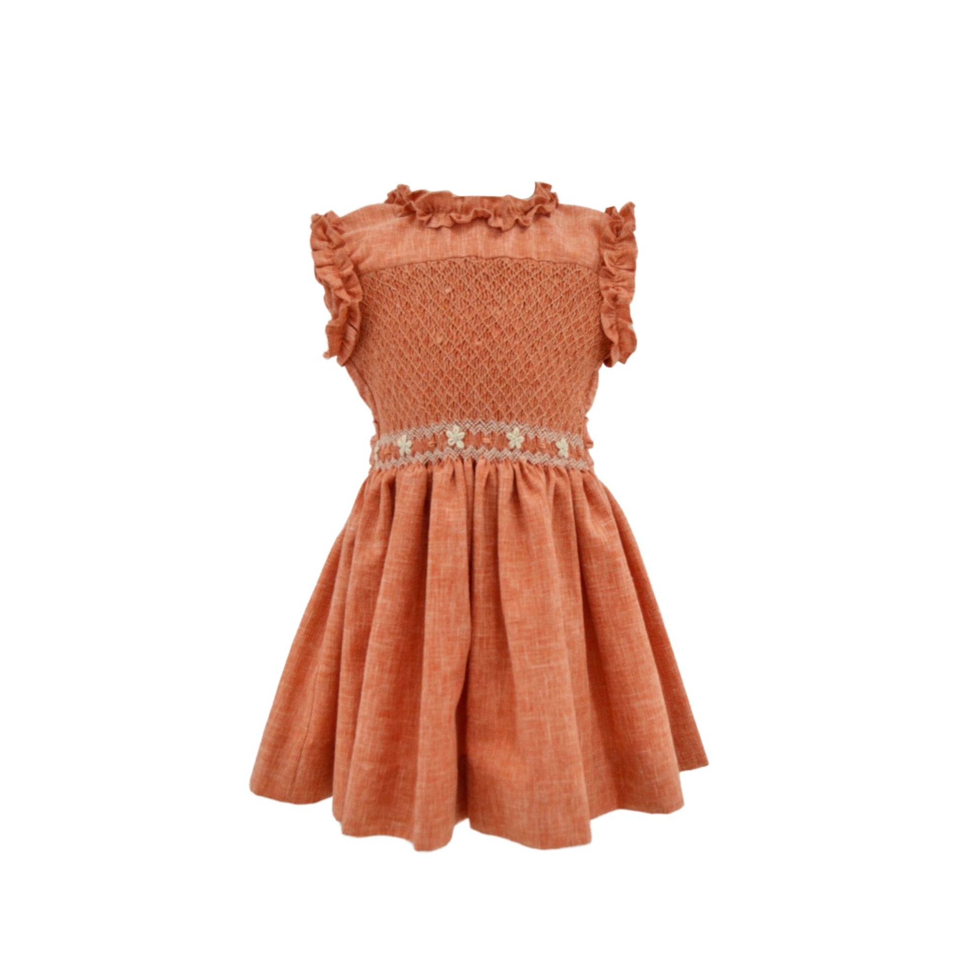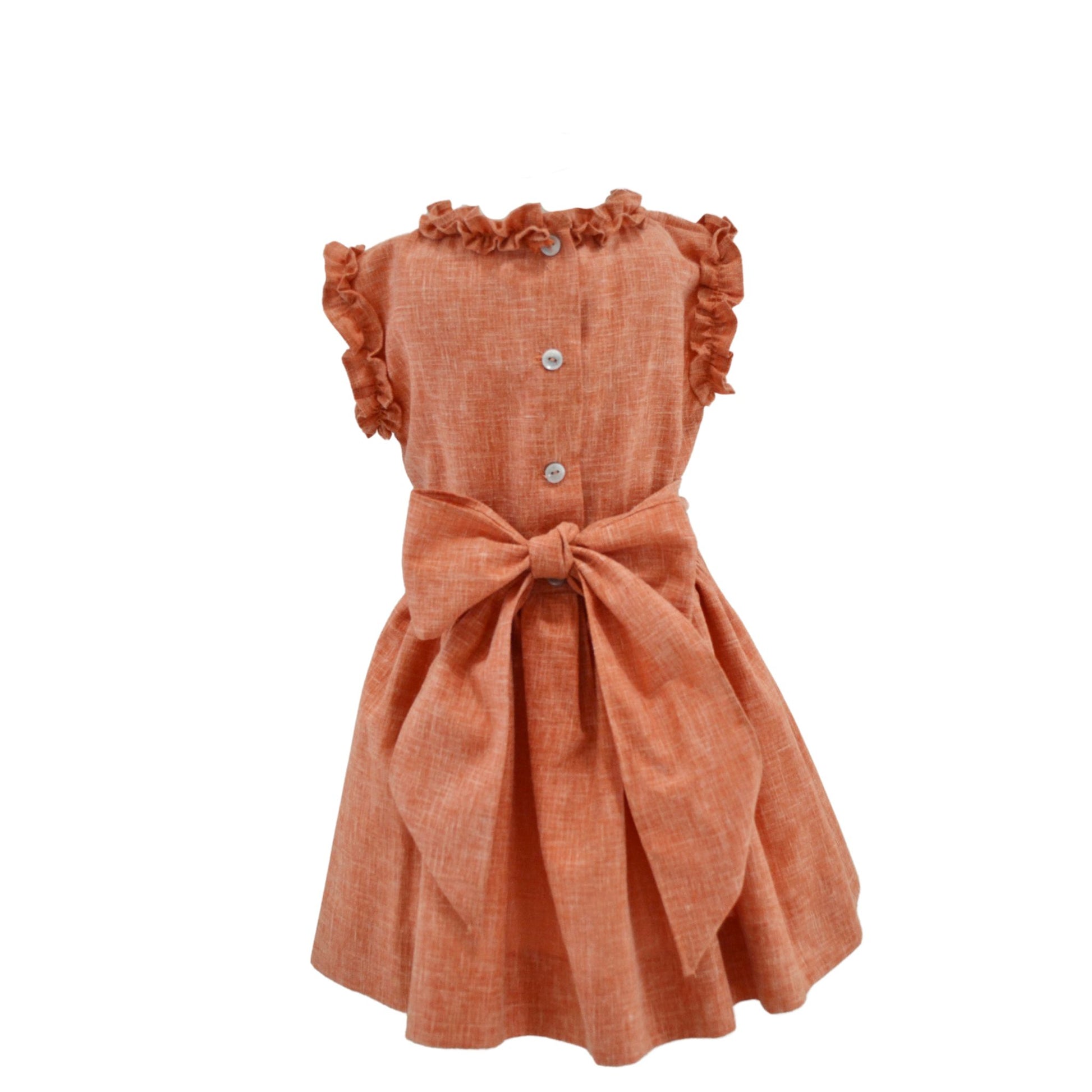 El Vestido Marruecos en lino terracota, con encantadores detalles de escarola y smock, está confeccionado con lino de alta calidad. Este vestido combina comodidad y estilo, ideal para las más pequeñas.