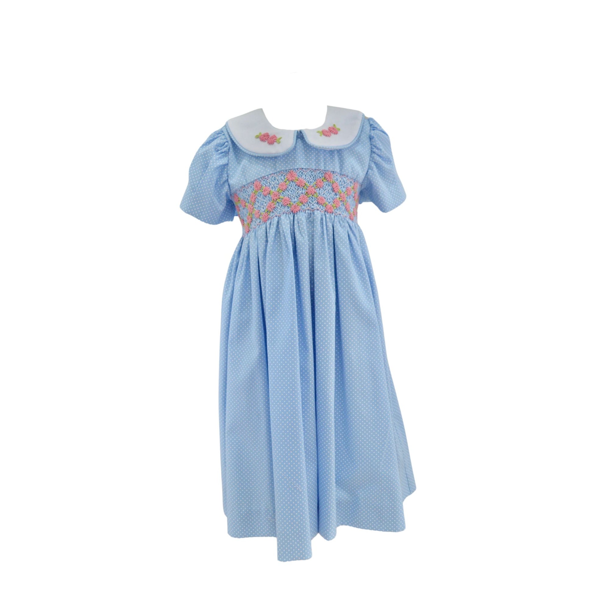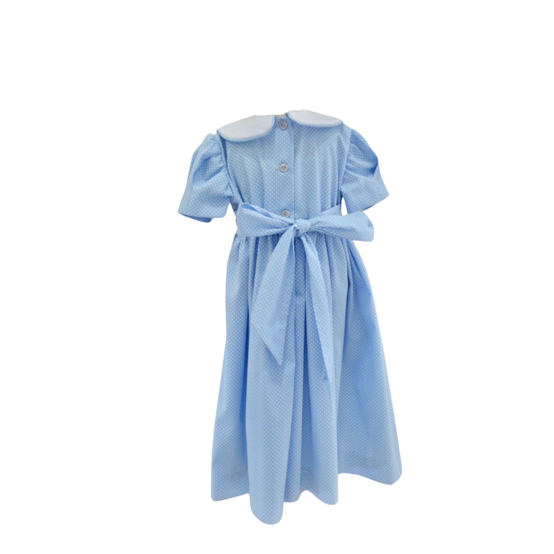 Confeccionado en piqué azul de alta calidad, este elegante vestido presenta un hermoso cuello bordado que añade un toque de sofisticación.