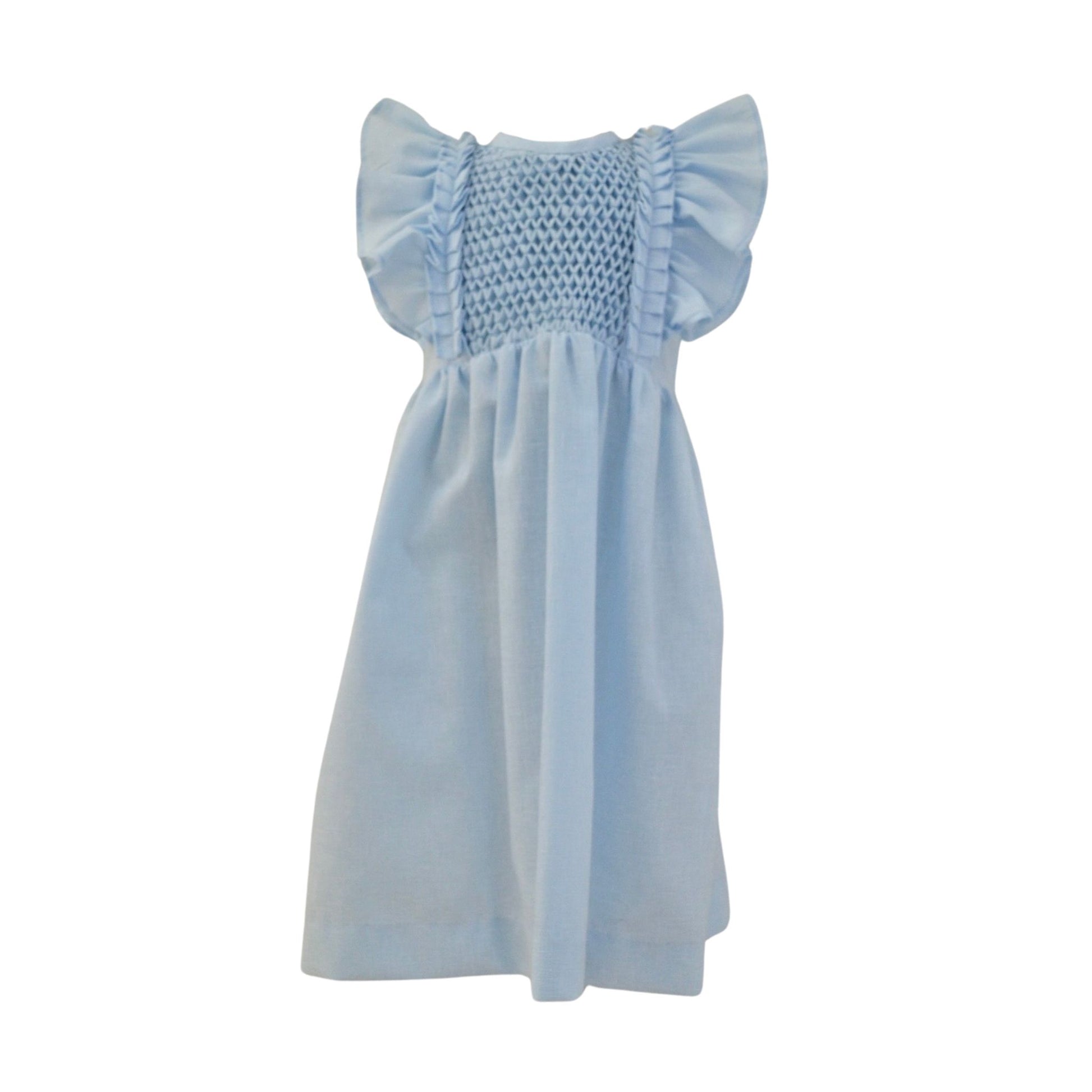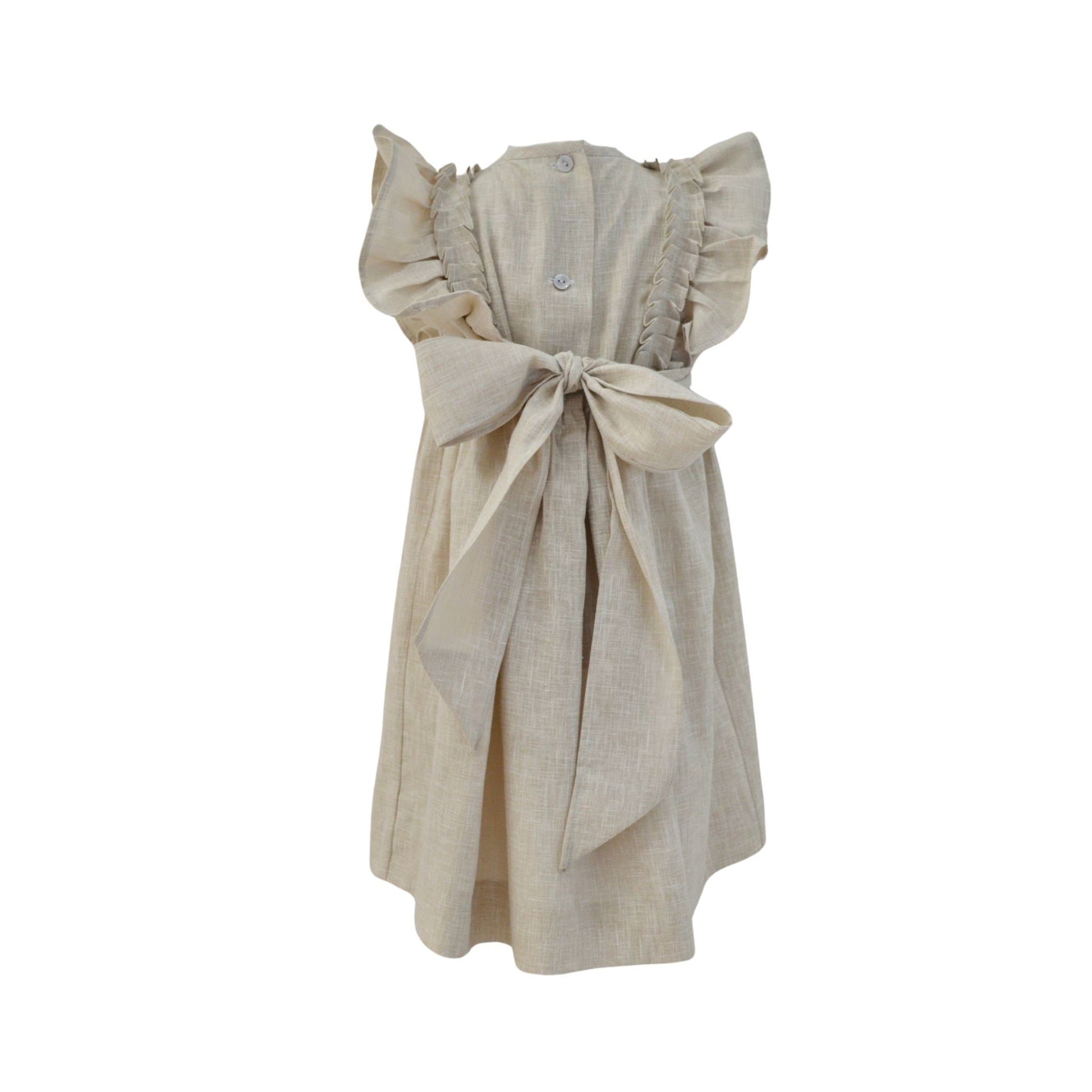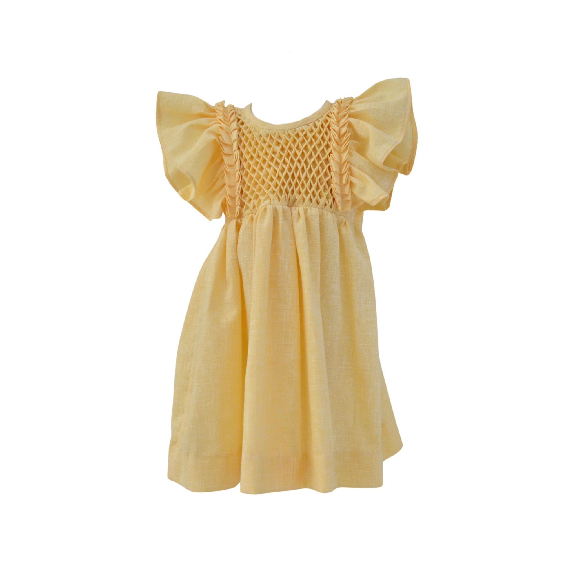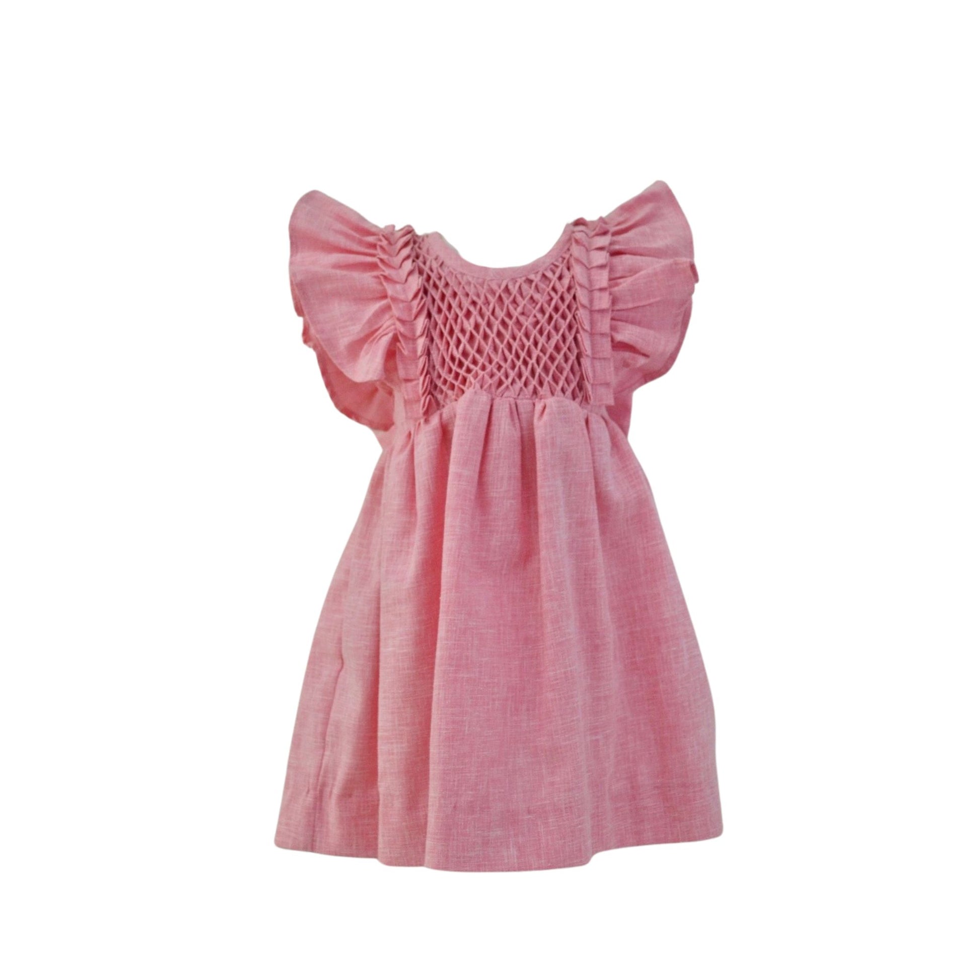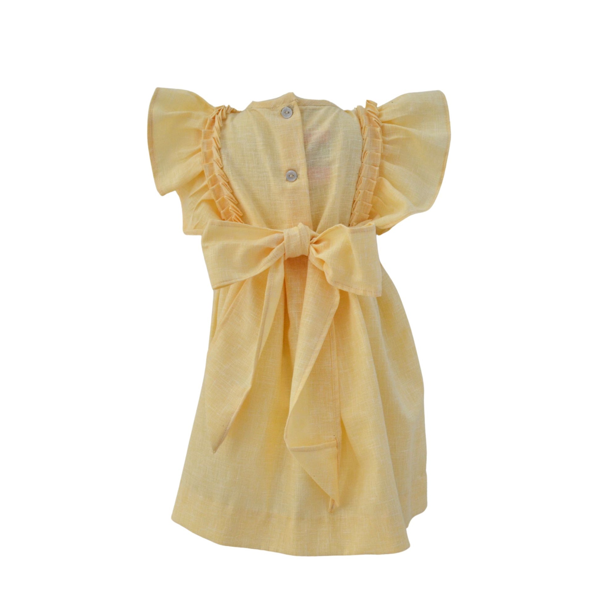 El Vestido Panalillo en lino está disponible en azul, rosa, amarillo y beige. Confeccionado en tallas desde la 1 hasta la 6, este vestido ofrece comodidad y estilo para las más pequeñas con su olan encantador que lo hace lucir super lindo.