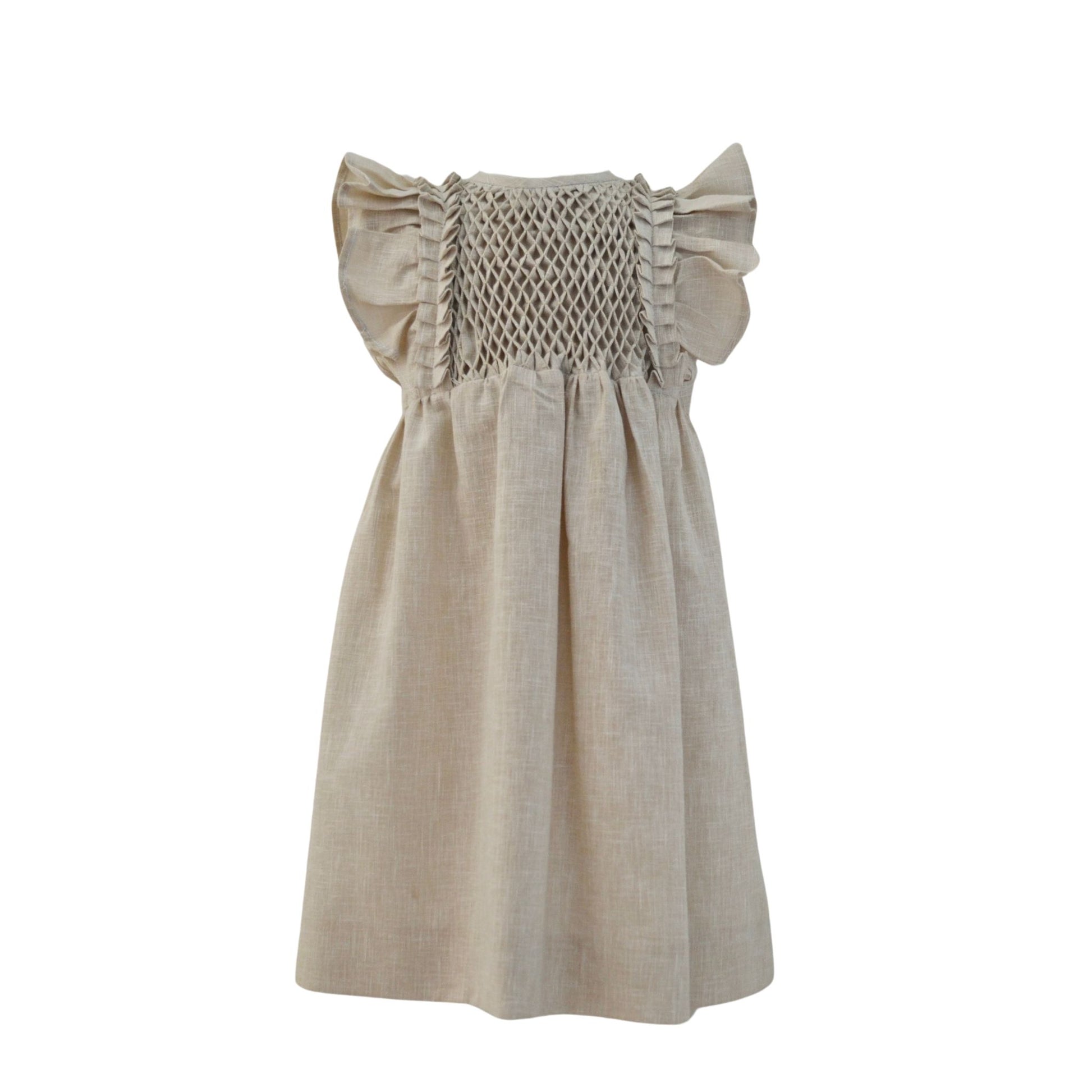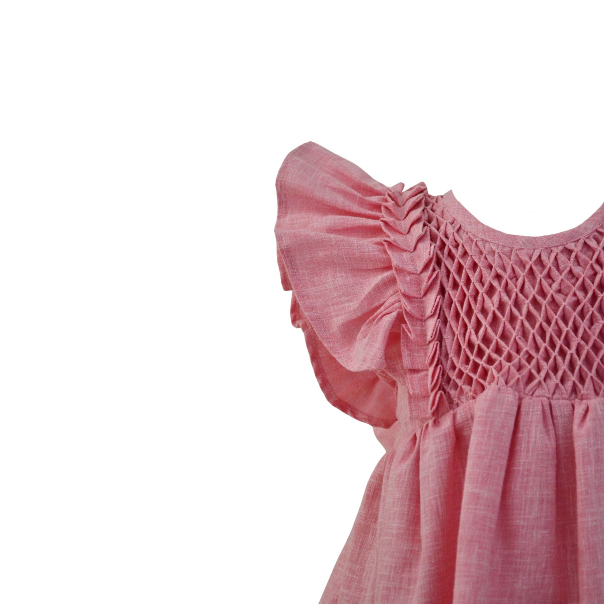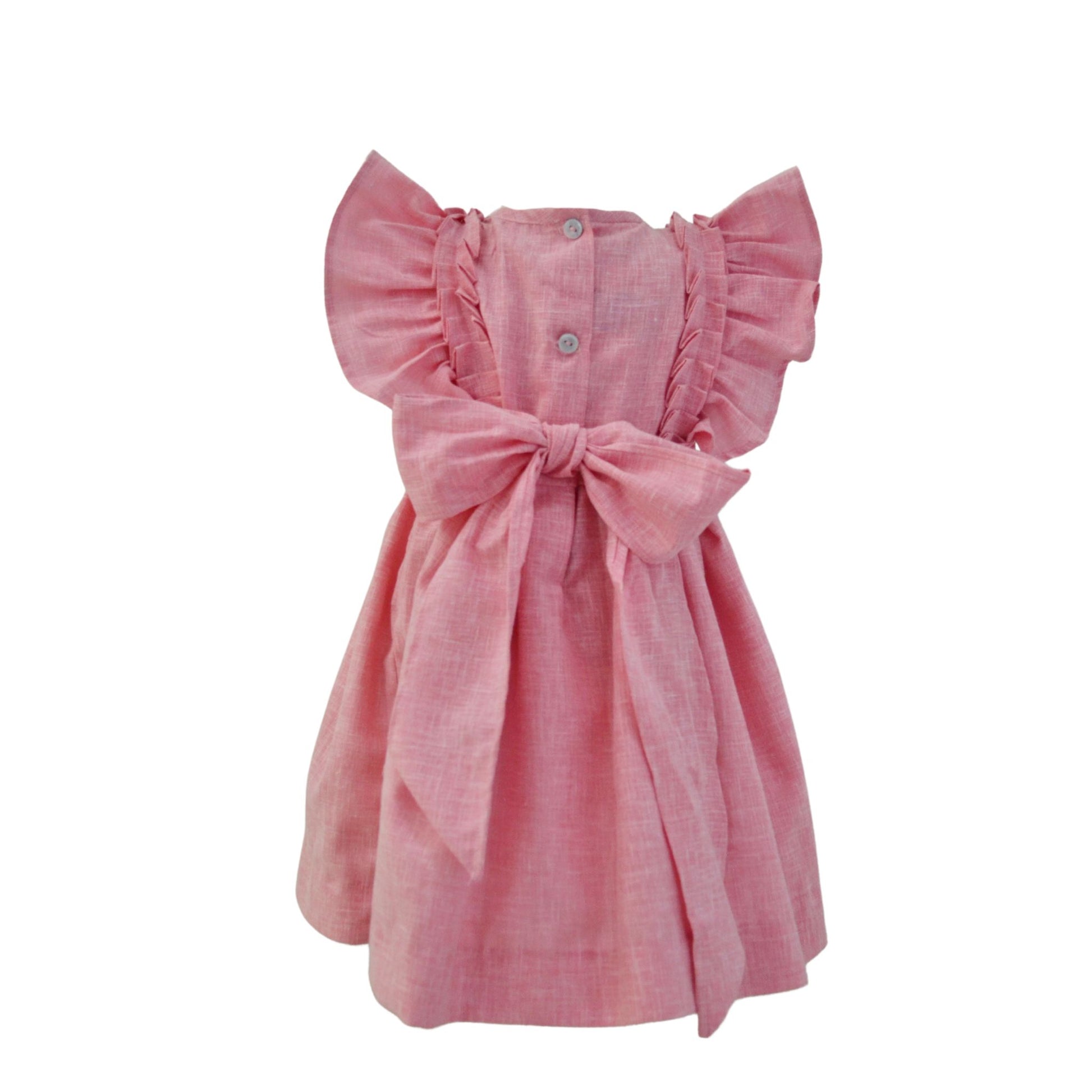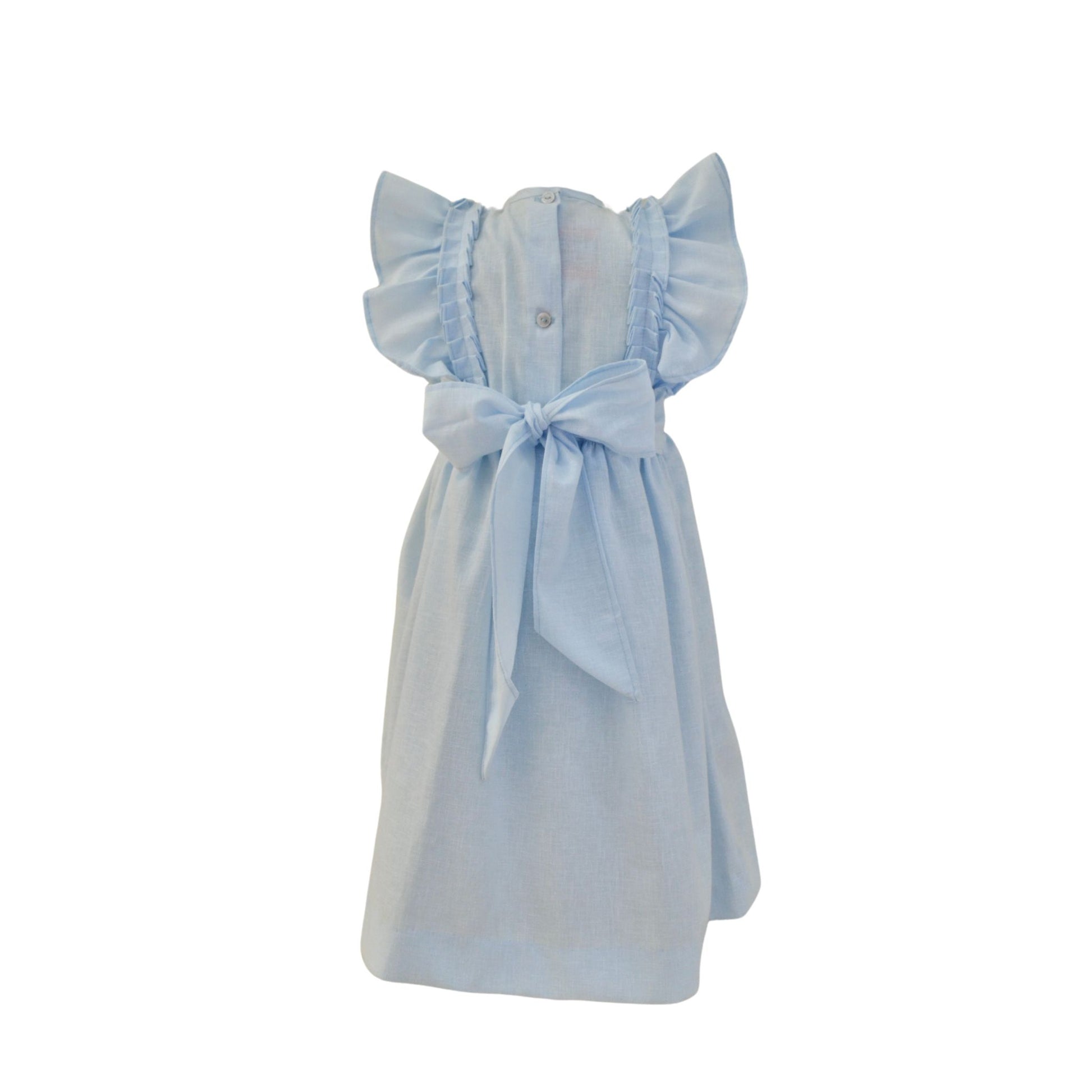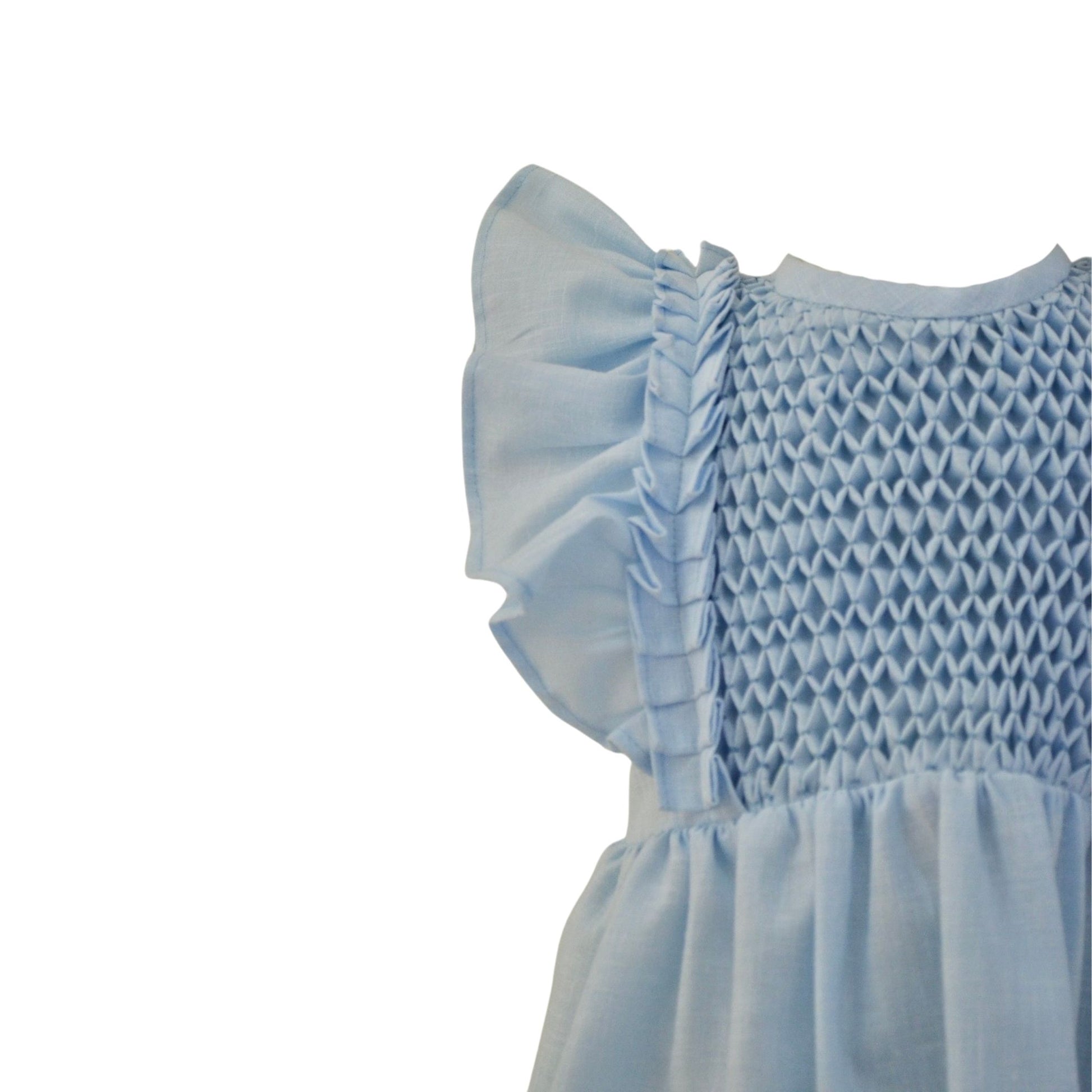 El Vestido Panalillo en lino está disponible en azul, rosa, amarillo y beige. Confeccionado en tallas desde la 1 hasta la 6, este vestido ofrece comodidad y estilo para las más pequeñas con su olan encantador que lo hace lucir super lindo.